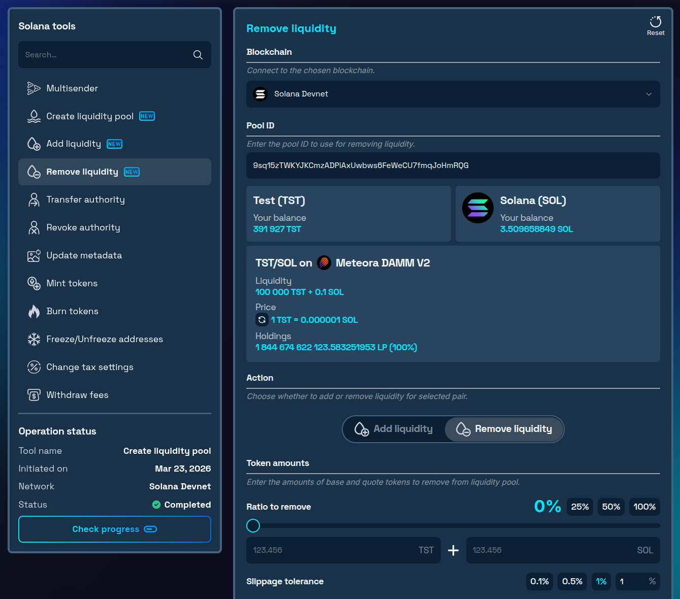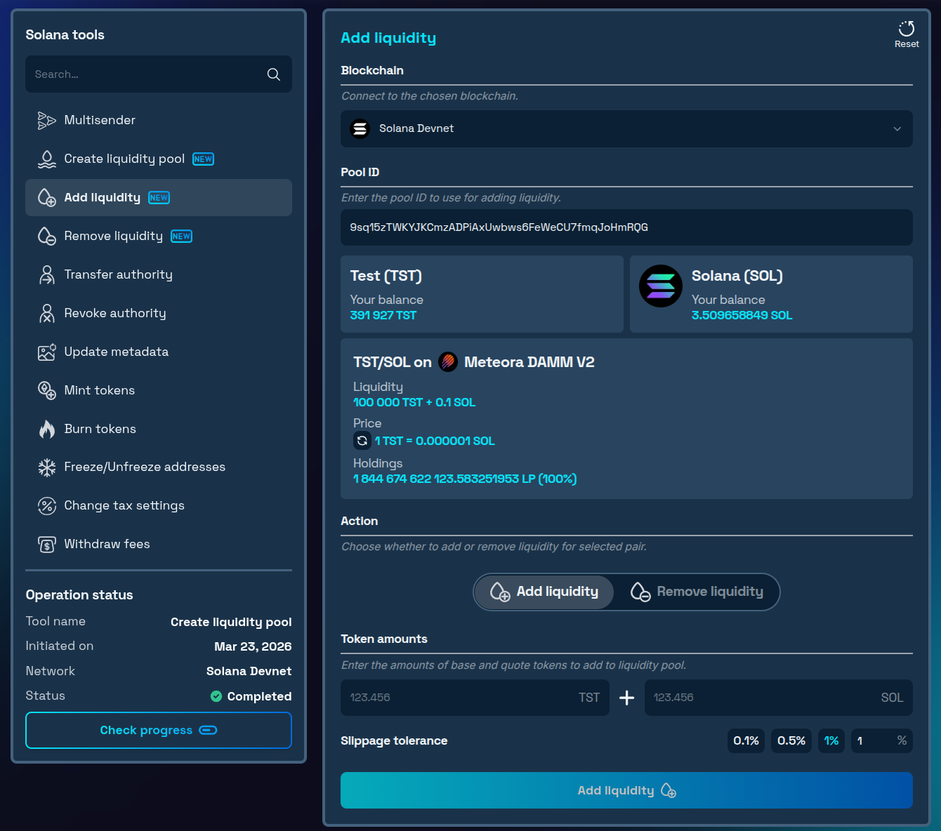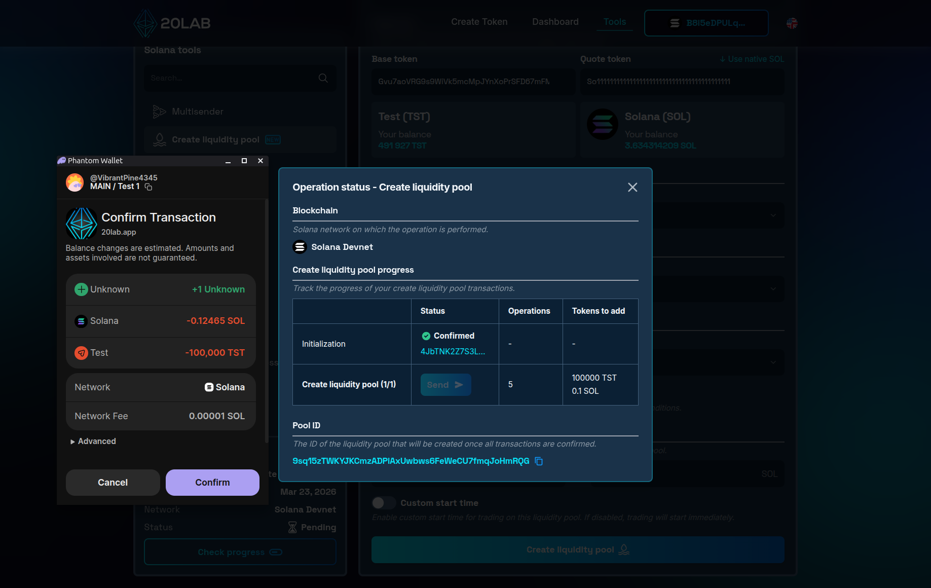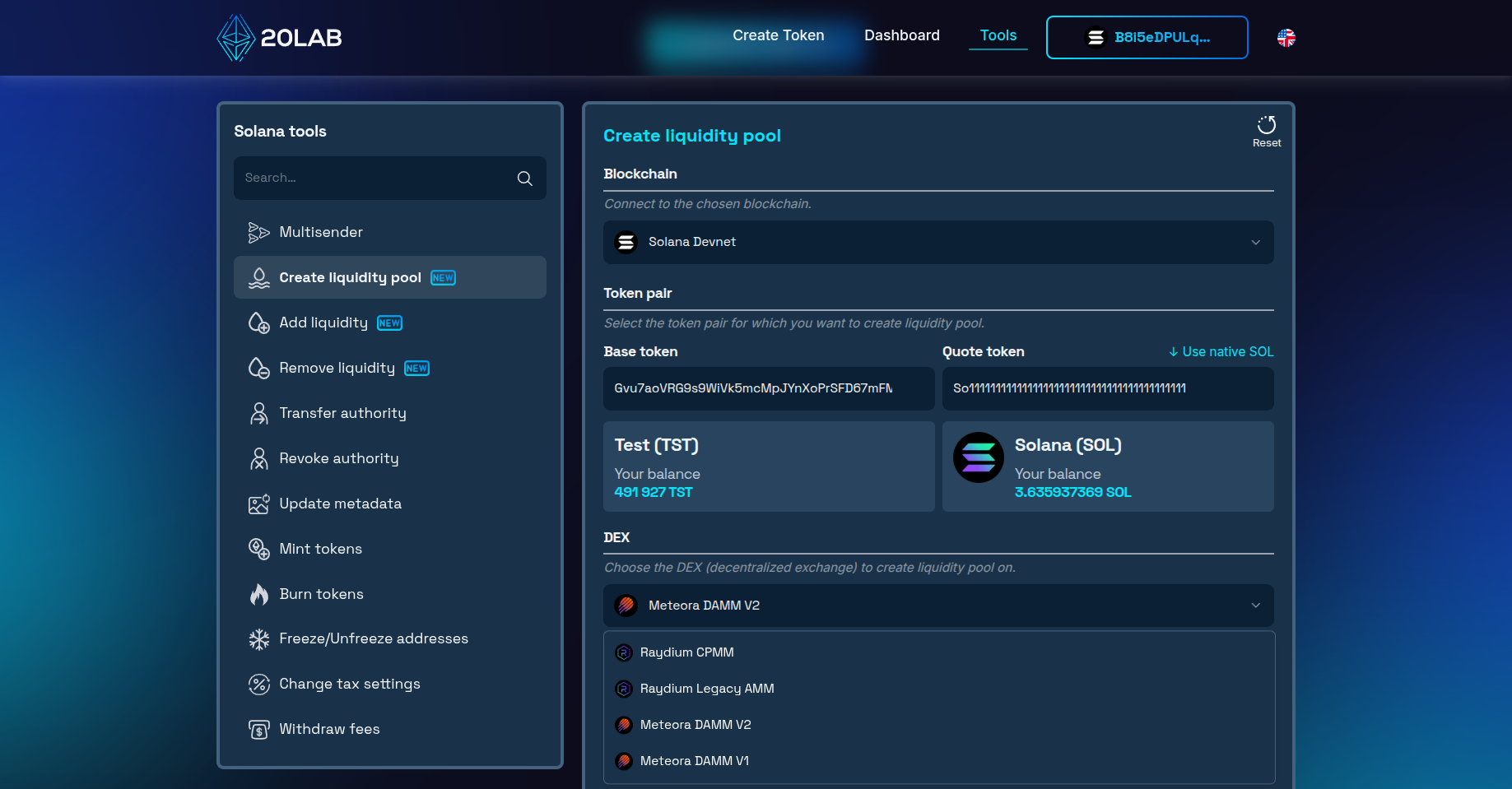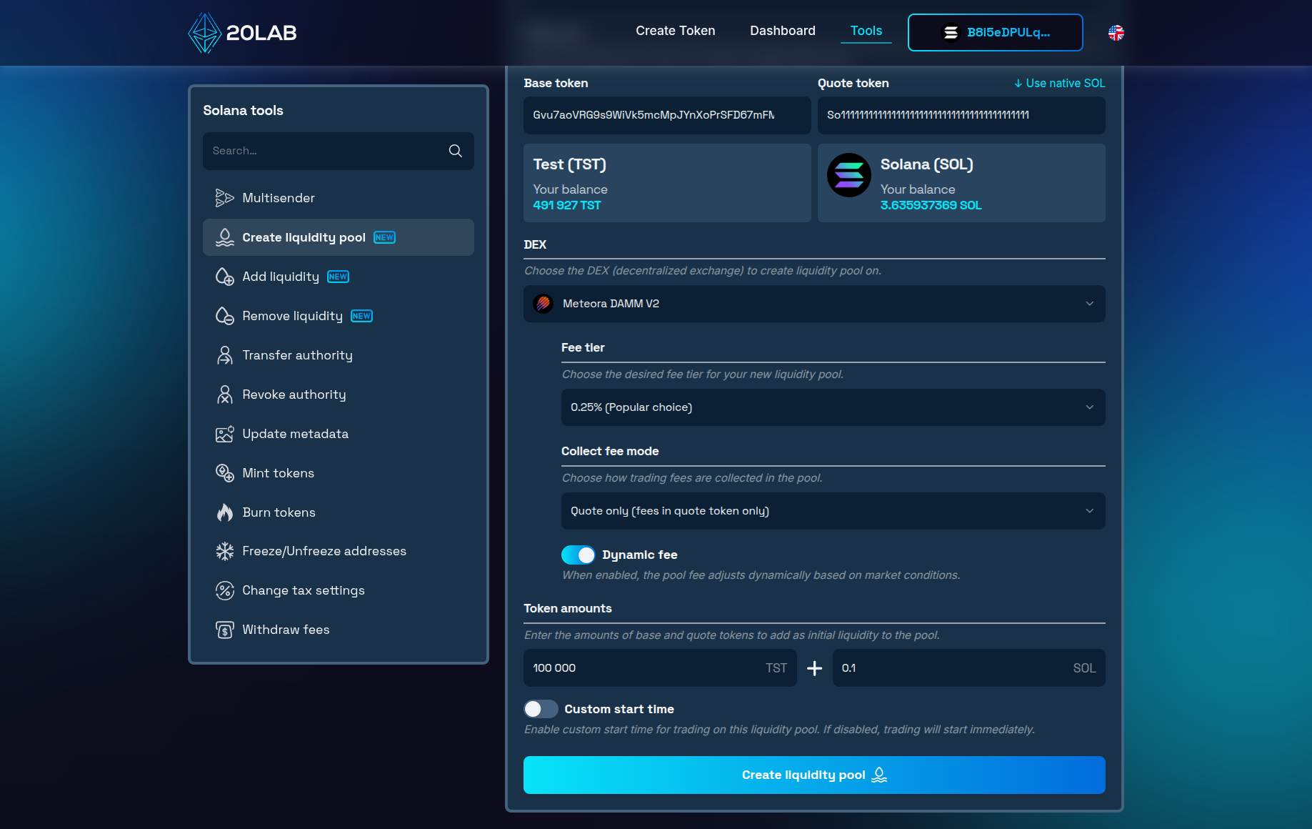 Adding liquidity to Meteora is straightforward when you have the right tools behind you. By using 20lab's liquidity pool creation tool, you can go from token creation to an active trading pool in just a few steps - without needing to navigate multiple platforms or deal with complex setup requirements.