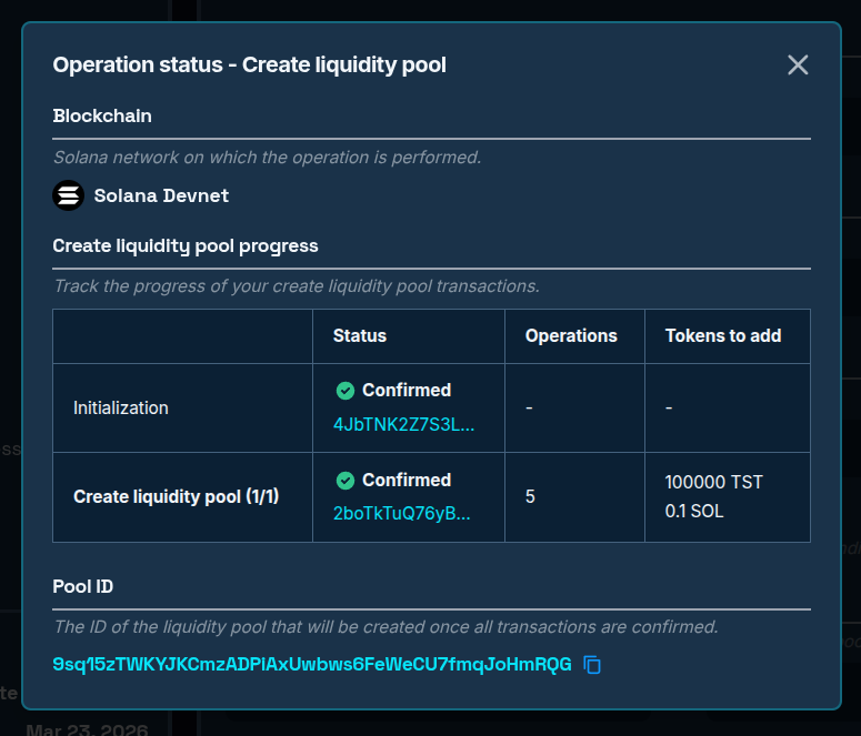 Once all transactions are confirmed, your pool will be live and accessible under its automatically assigned pool ID, which you can copy directly from the operation status window.