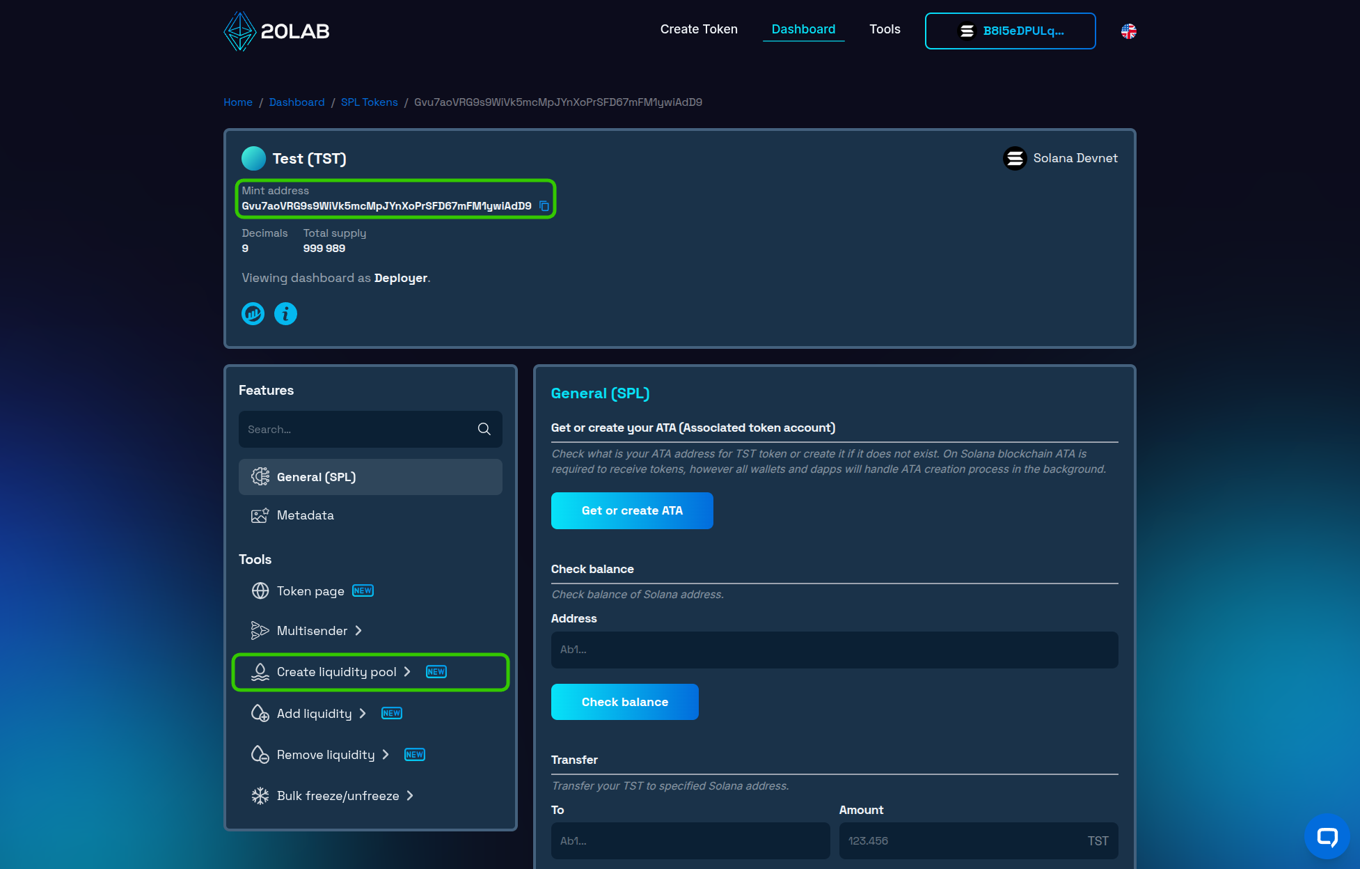 If you created your token on 20lab, you can easily copy the token mint address from the dashboard or access the Solana liquidity pool creation tool directly.