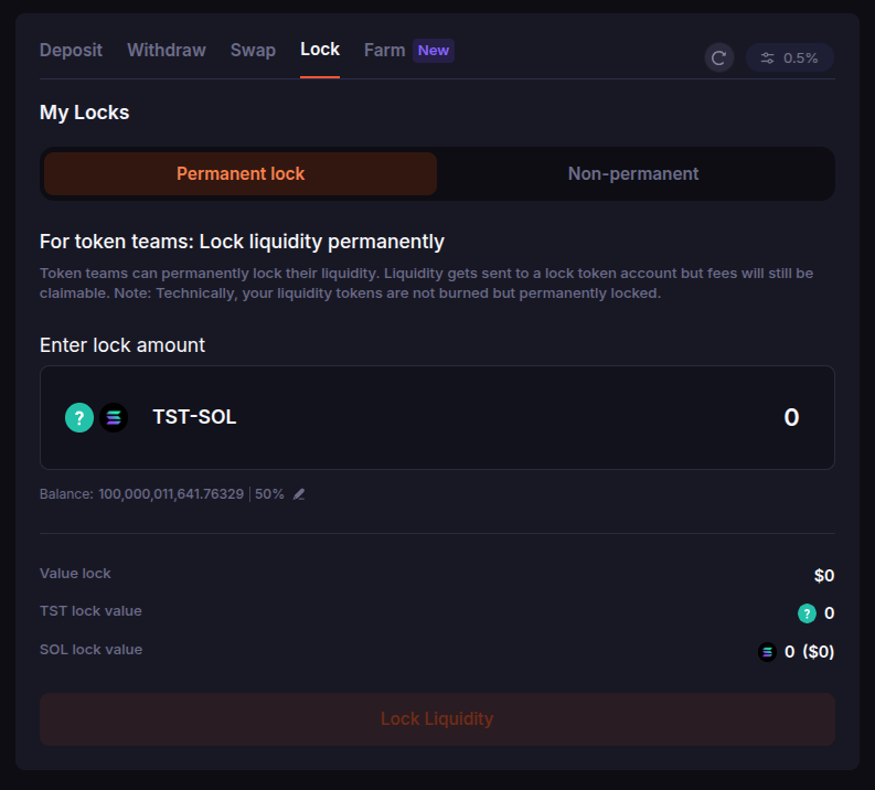Note: Permanent locking is irreversible. Once confirmed, there is no way to recover the LP tokens or withdraw the underlying liquidity. Make sure this aligns with your long-term plans before proceeding.